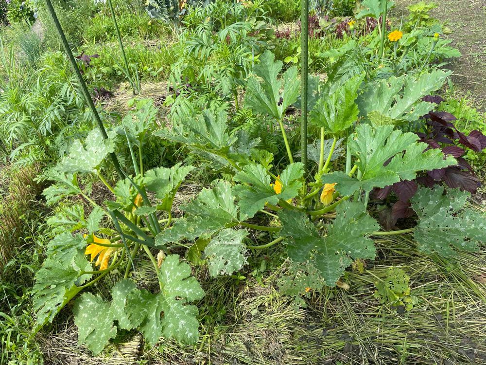 ズッキーニ6株育て中。直播き3と、育苗3で、直播きしたもののほうが生育がよいです。モザイク病とウリハムシに悩まされ中🌀