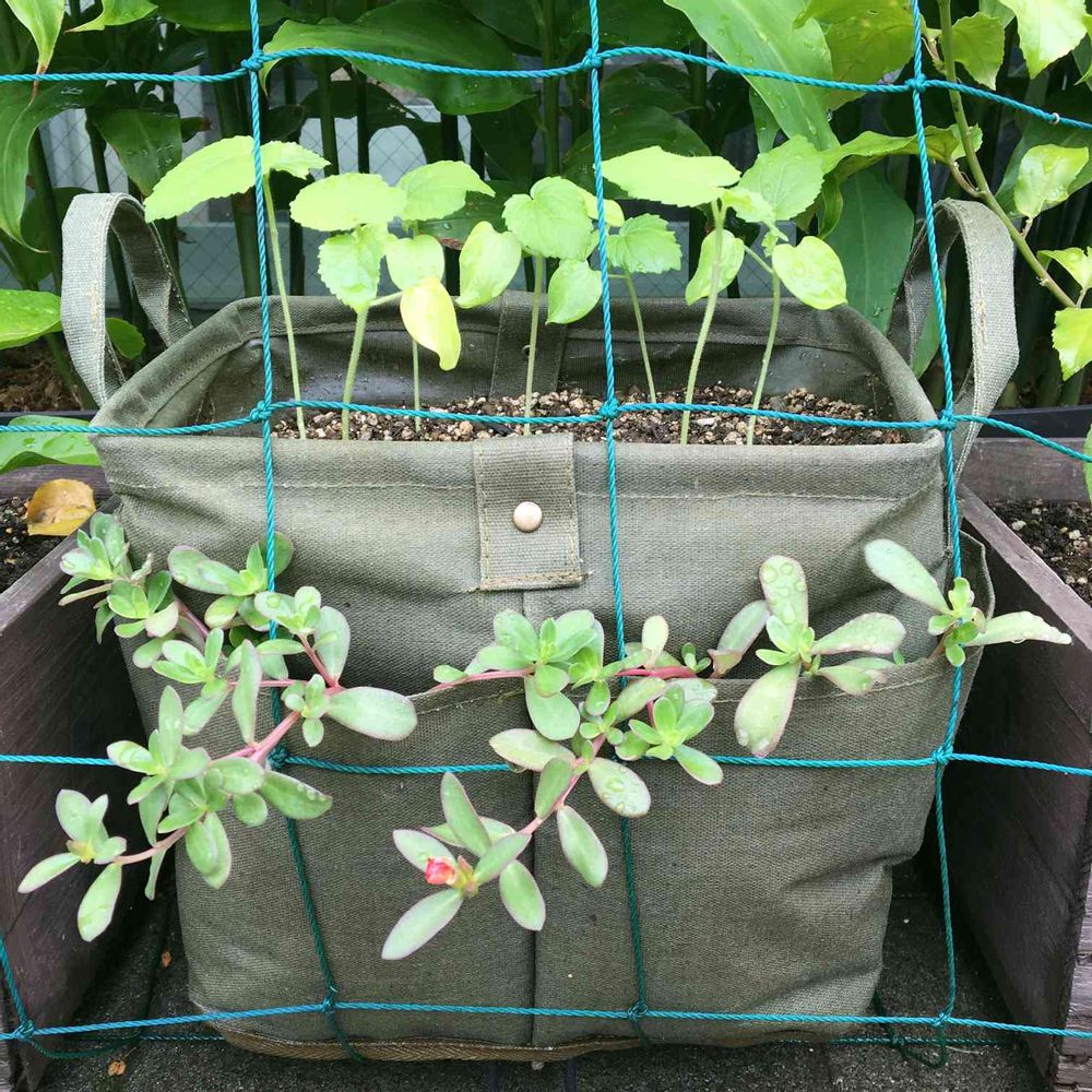 オクラの苗をダイソーの300円収納バスケットに植えました🌱防水加工してあるので底穴空けても丈夫そう👌オクラは深町先生の仰る通りに密植😊手前のポケットにポーチュラカの挿し芽苗も植えてみました😉