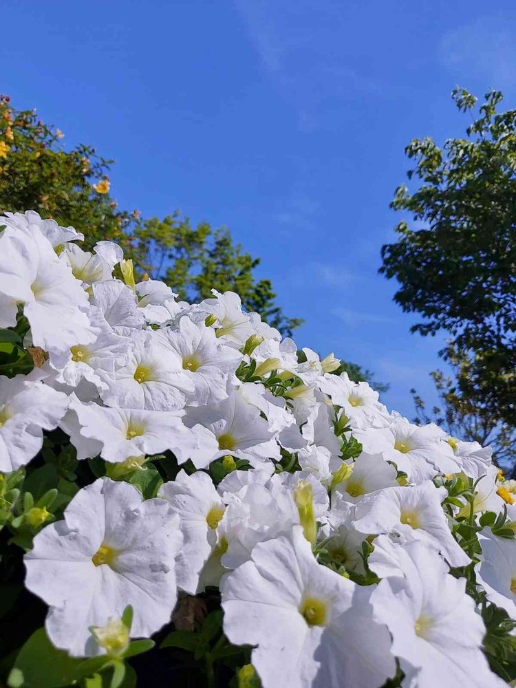 青い空に白いペチュニアが映えて素敵なコラボです🤩