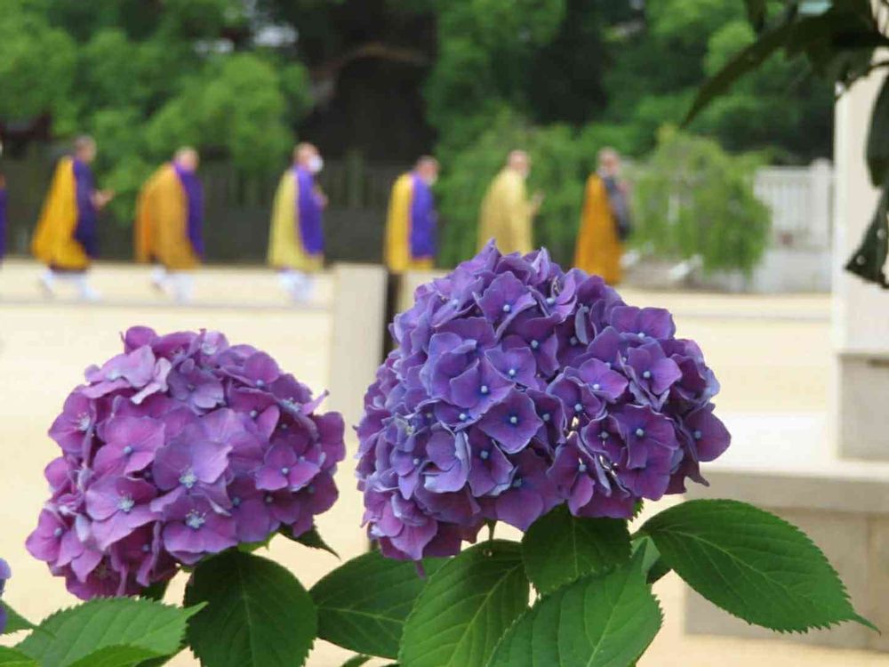 75番札所善通寺境内、僧侶さん達がお経を唱えながら行進する様子をシックな色合いの紫陽花さんが見守り、荘厳な気持ちになりました。