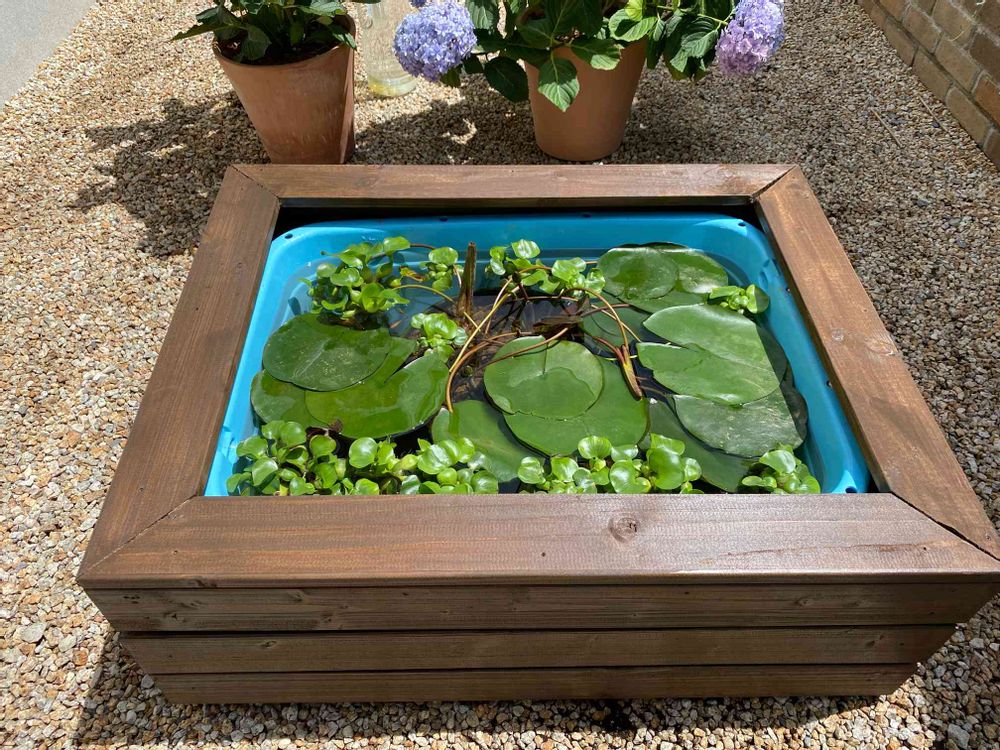 池の睡蓮🌸 鯉が花を食い散らかすのでメダカと共に隔離しました。ホテイアオイにはメダカのたまご🥚がたくさんついてたのでポコポコ孵化中です🐟 タライ丸見えはイヤだったので主人に囲いを作成してもらいました⚒