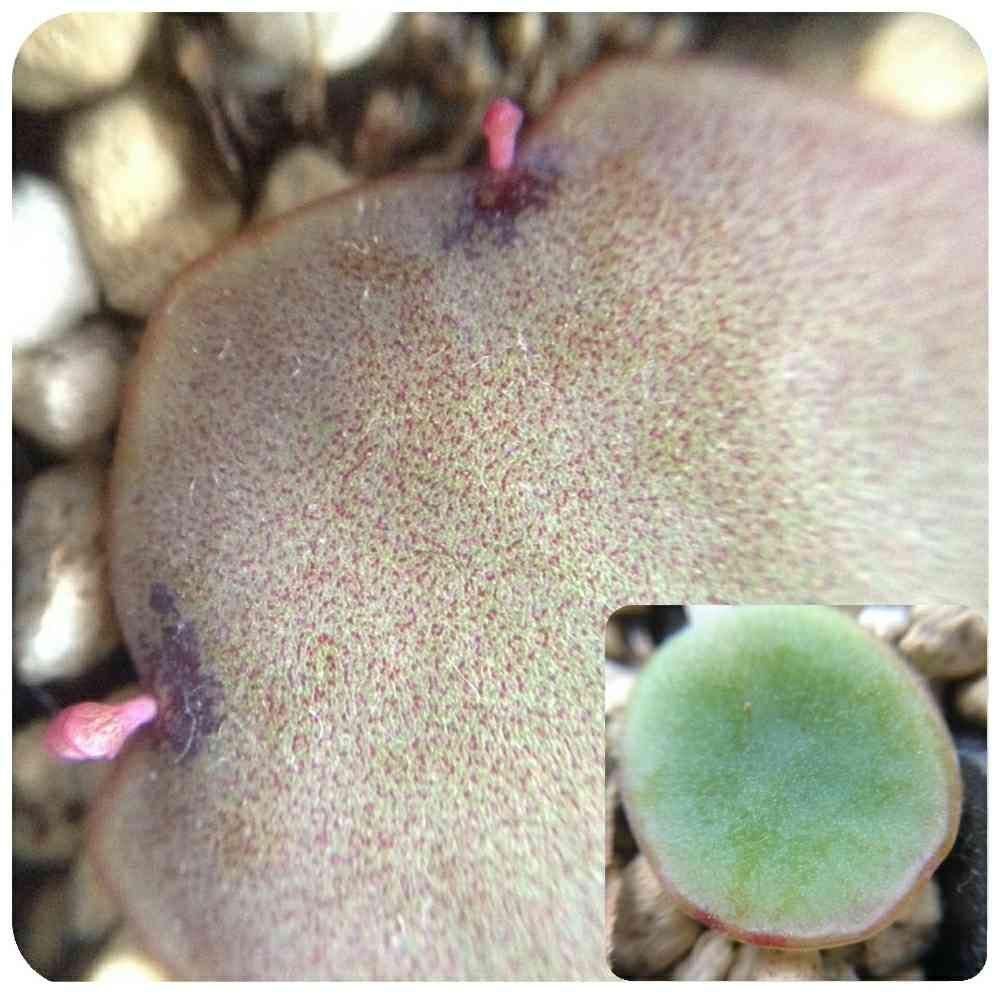 葉をもぎってから三週間。かわいい子が見えてきました。この凹んだとこから新芽が出るなら、マルニエリアナの葉っぱは発芽しないのかなぁ?