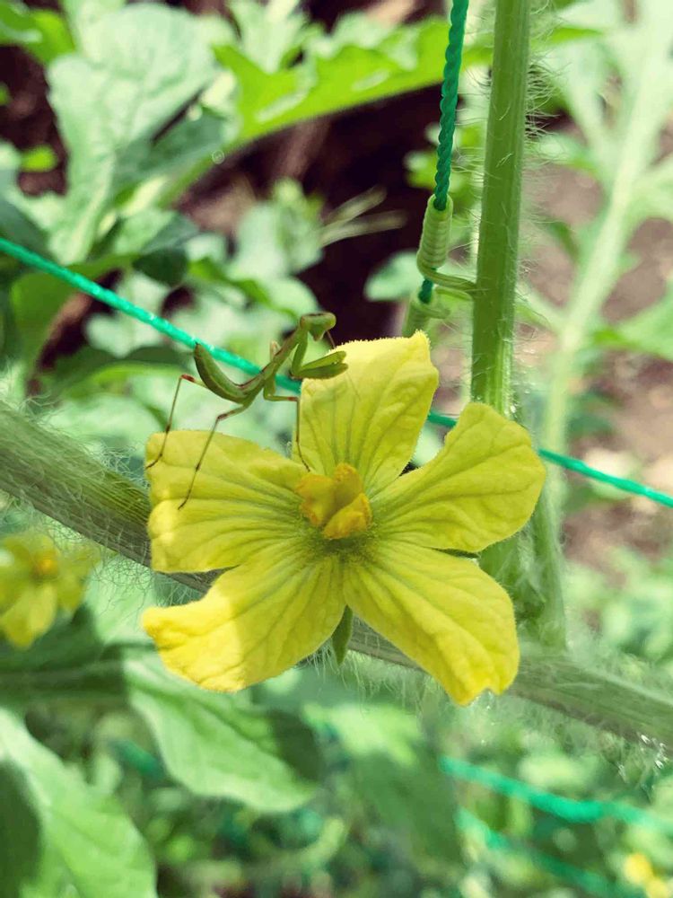 今朝、小玉スイカの花で出会ったカマキリの赤ちゃん。可愛い😍