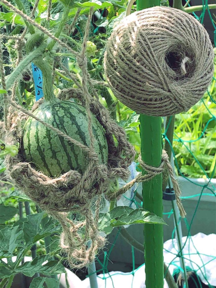 さん^_^ おはよーございます 麻紐でスイカ🍉吊りを初めて作ったらサイズが実に合わず下敷きをひきました😅重さが出て来て楽しみです🍉🎶