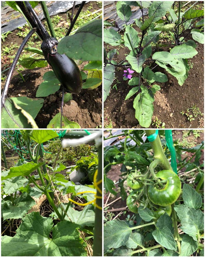 家庭菜園から ちょっと元気がなかったナスが、成長して実も大きくなってきました。キュウリの苗も背を伸ばしています。中玉トマト少しずつ実が育っています。🍆🍅🌿🌿キュウリの葉近くにキュウリの赤ちゃんがいます。雌花ですね💙