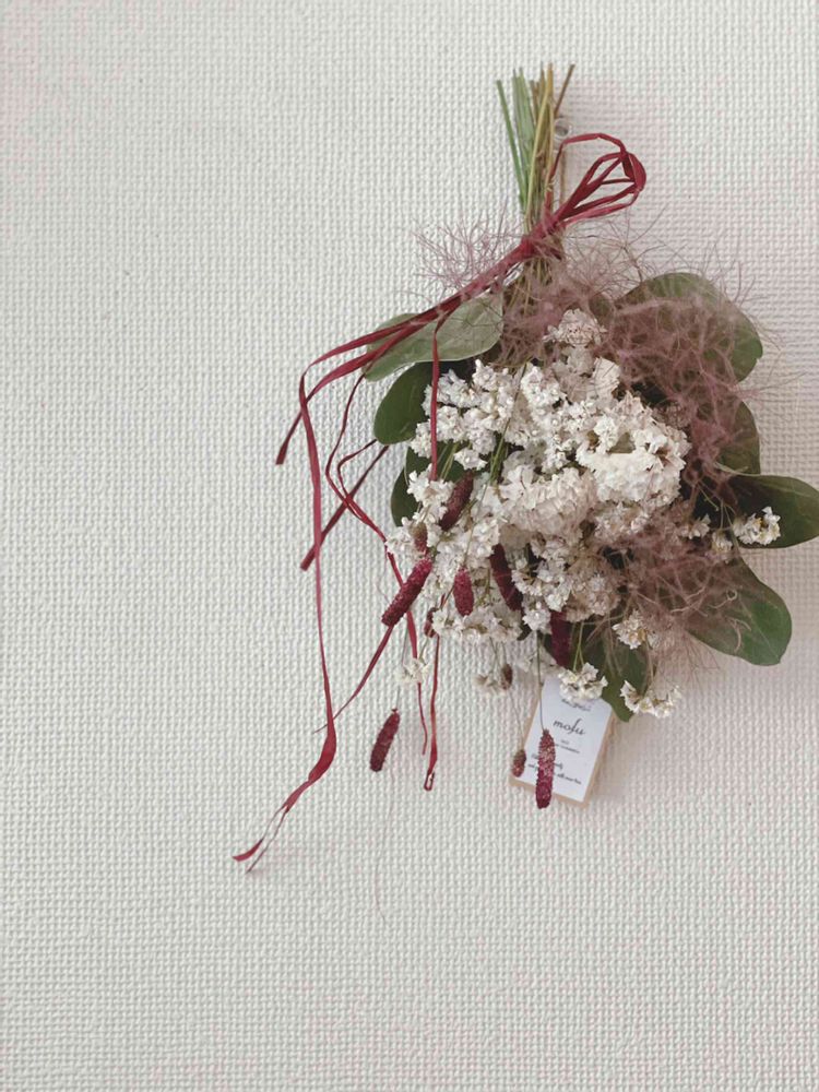 われもこうのボルドー色とスモークツリーのピンクが可愛いミニスワッグ🌸🌸🌱