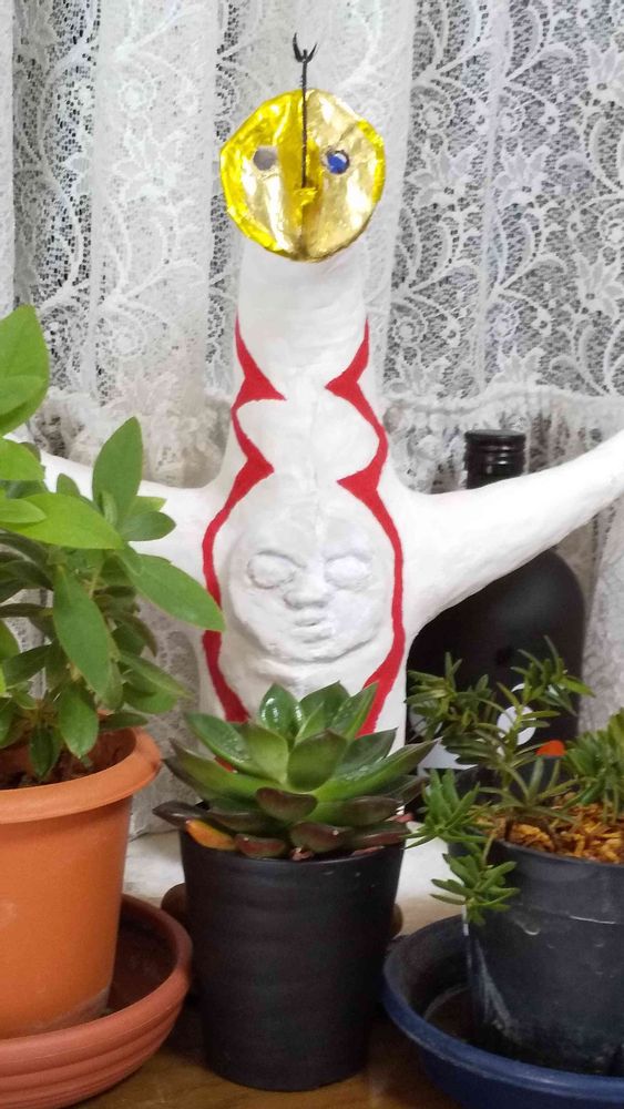 ツツジ、エケベリア、キャラボクに囲まれて「太陽の塔」さん、ご機嫌です。🤗😄🌿