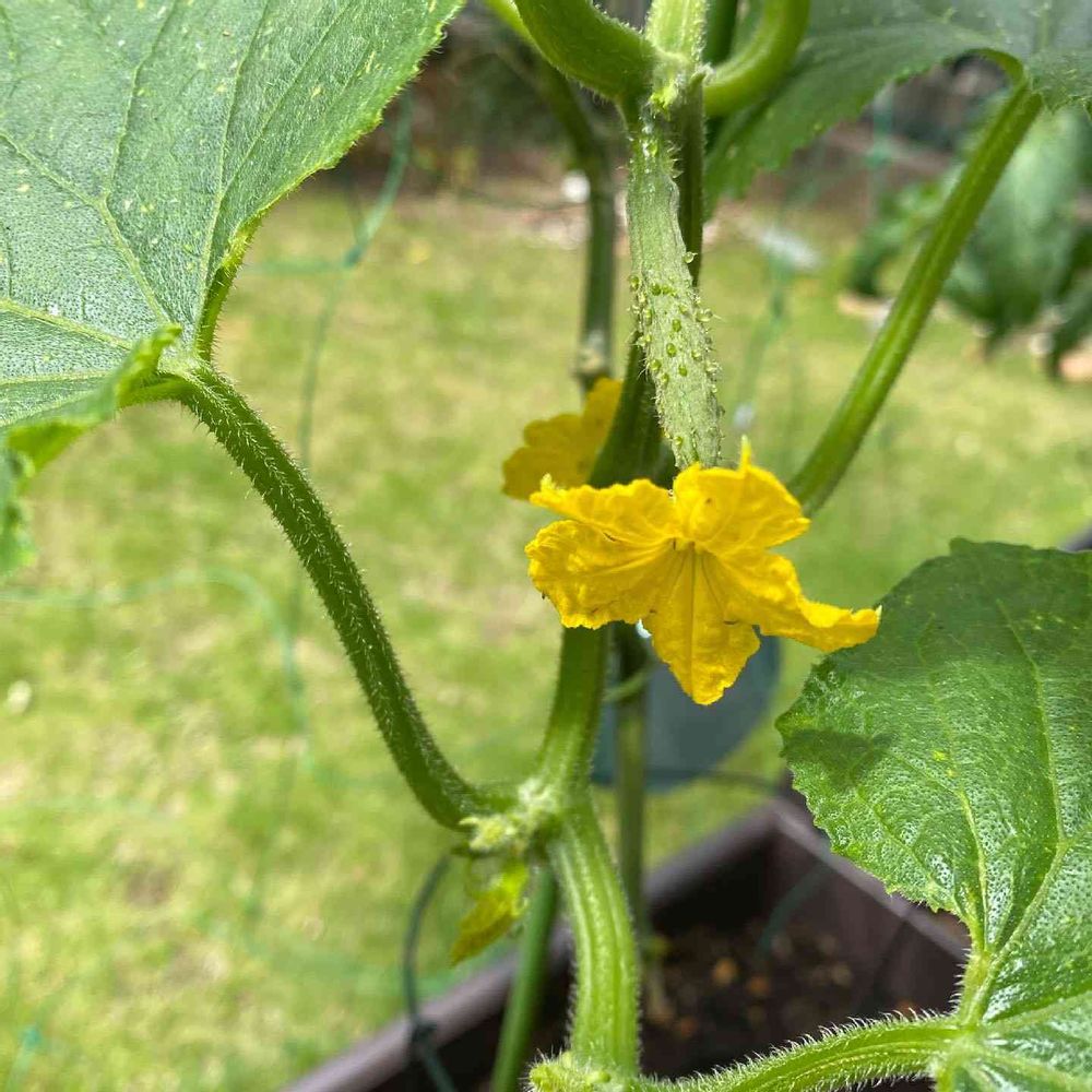 きゅうりの苗はこの苗ひとつだけなのですがすでに小さく曲ったきゅうりと2本目が収穫できています🤗こちらは3本目になる予定⁉️なので、アドバイス通り1本目は小さく収穫しているので良かったみたいです👍