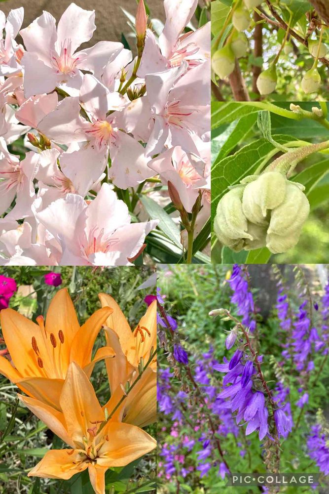歩道脇に咲いていたオレンジ色のユリと紫色のお花も綺麗でした