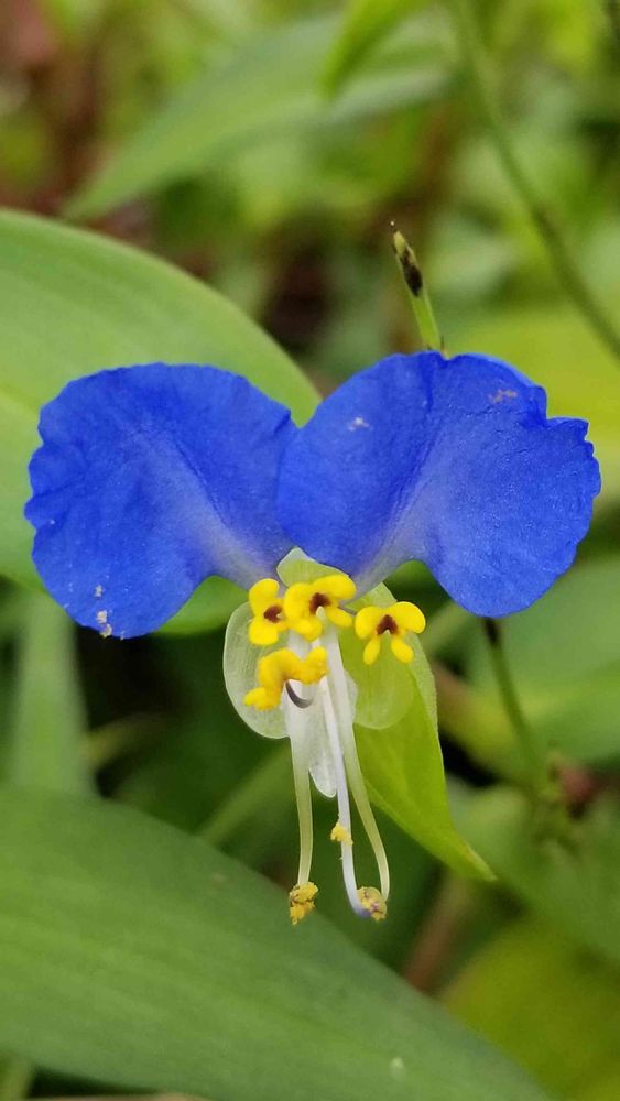 2枚の花弁は大きく鮮やかな青色、残りの1枚は小さく白い。