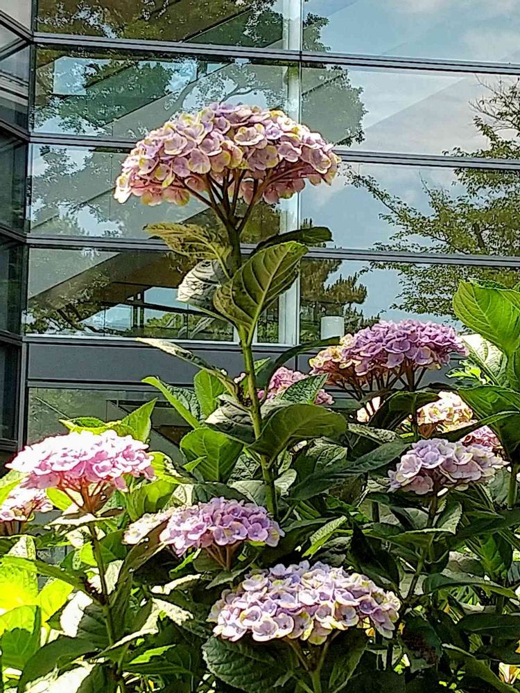 隣接する県立美術館の窓に、梅雨の晴れ間の青空と、庭園の木立が映っています🌿🌿🌿