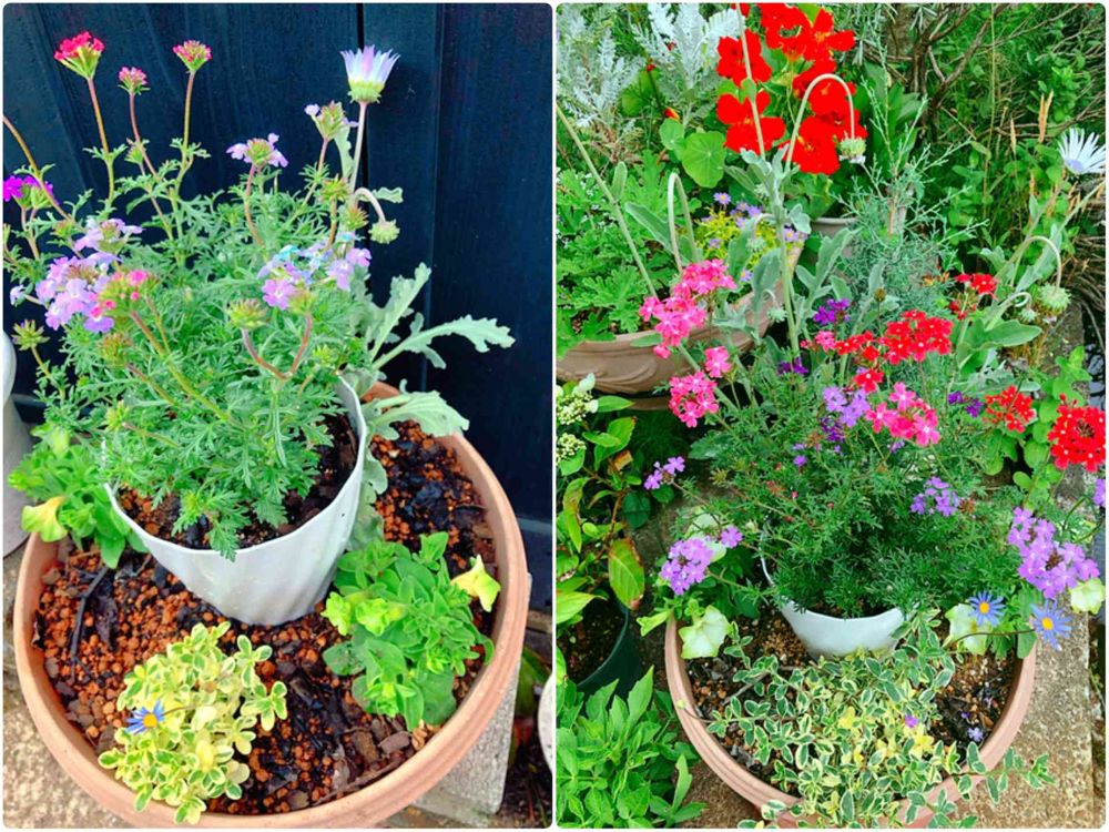 ①② 3色混合のバーベナを中心に見えにくいですが後ろにアークトチスグランティス、両サイドにペチュニア純翠、正面に斑入りブルーデージー。