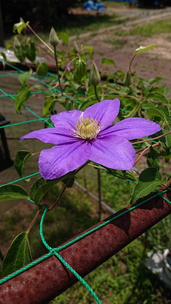 🌺ビニールハウスの使って無いアーチ2本に100均の野菜ネットを貼ってクレマチスを這わせて見たよ。