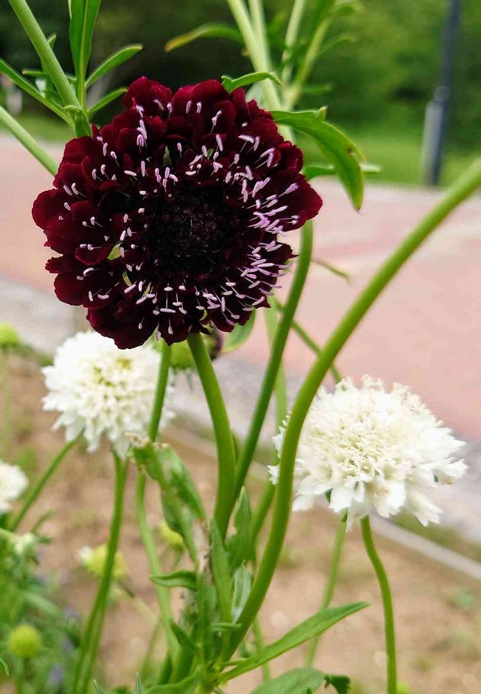 暗赤紫色のスカビオサ 初めて見ました❗ ゴージャスな感じです😆