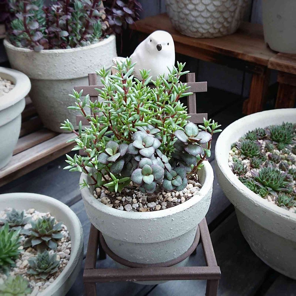 名無し(ハロウィン寄せ植え)で迎えて約2年間「なぞくん」と呼ばれていた沈黙のクラッスラ氏が漸く育ち始め、恐らく花月系だと最近気付く。めでたし。