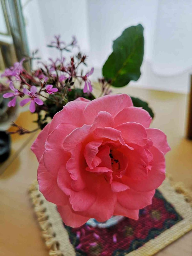 狭小ベランダに咲いたバラとペラゴリウムを窓辺に飾りました。こんなちょっとしたことができる心の余裕ができたことが嬉しい🎵😍🎵