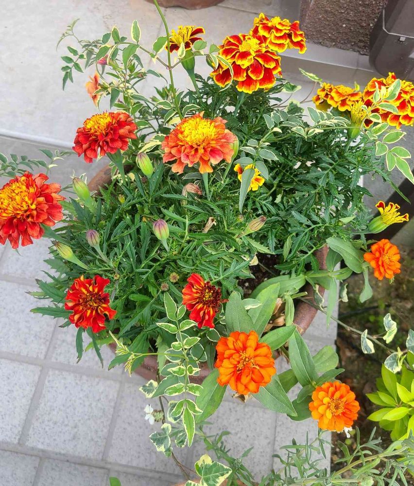 ビタミンカラーの寄せ植えがいい感じになってきました。