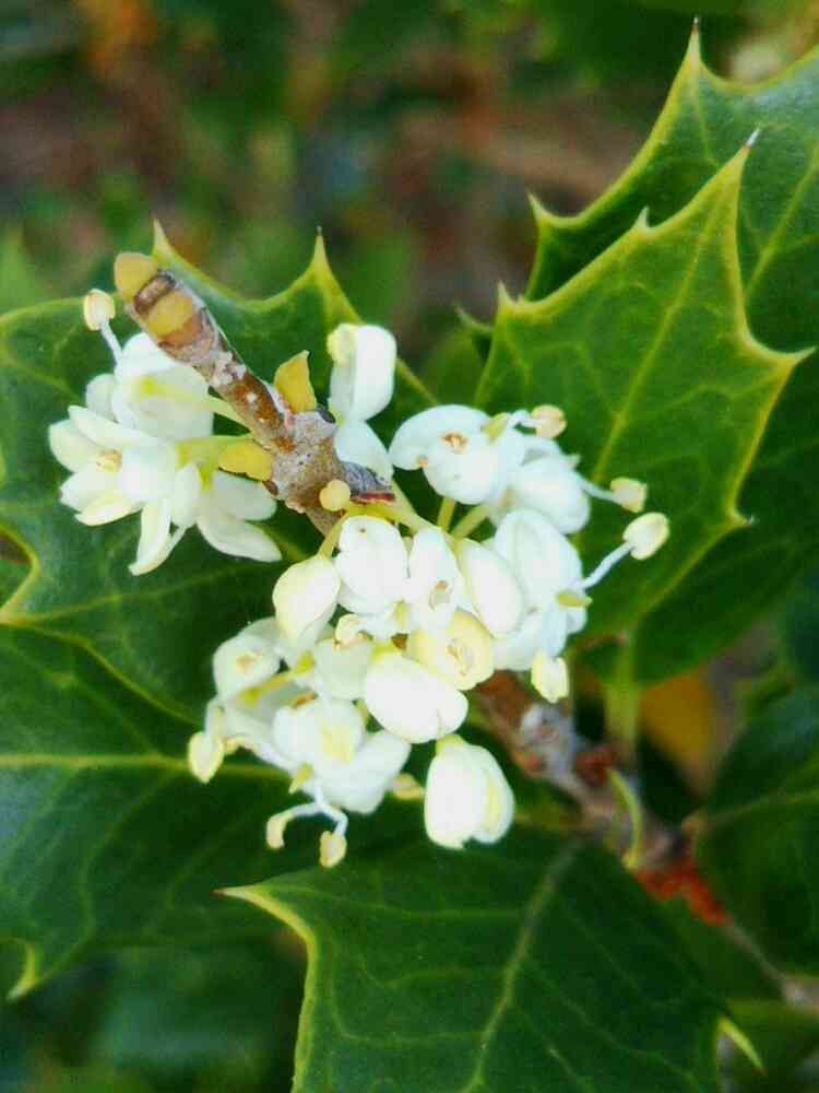 会社の植え込みの柊に お花が 咲いているのに気がつきました🎵