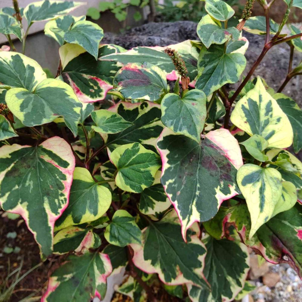 この斑入りのドクダミ、お隣さんが植えてる🌱普通のより増えないらしいね!臭い、弱め?