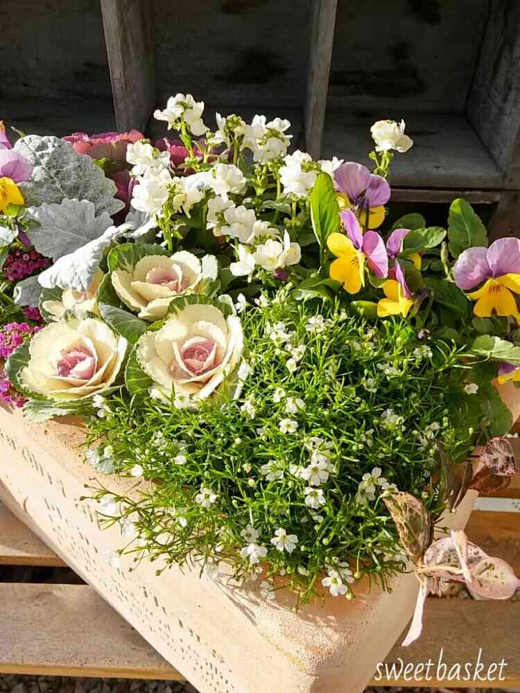 宿根ネメシア、葉牡丹、カスミソウ🐝.•*¨*•.¸¸♬