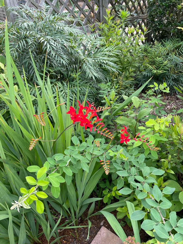 ボランティアガーデンのモントブレチアが開花しました。オレンジ色はよく見かけますが赤い花は珍しいですよねー
