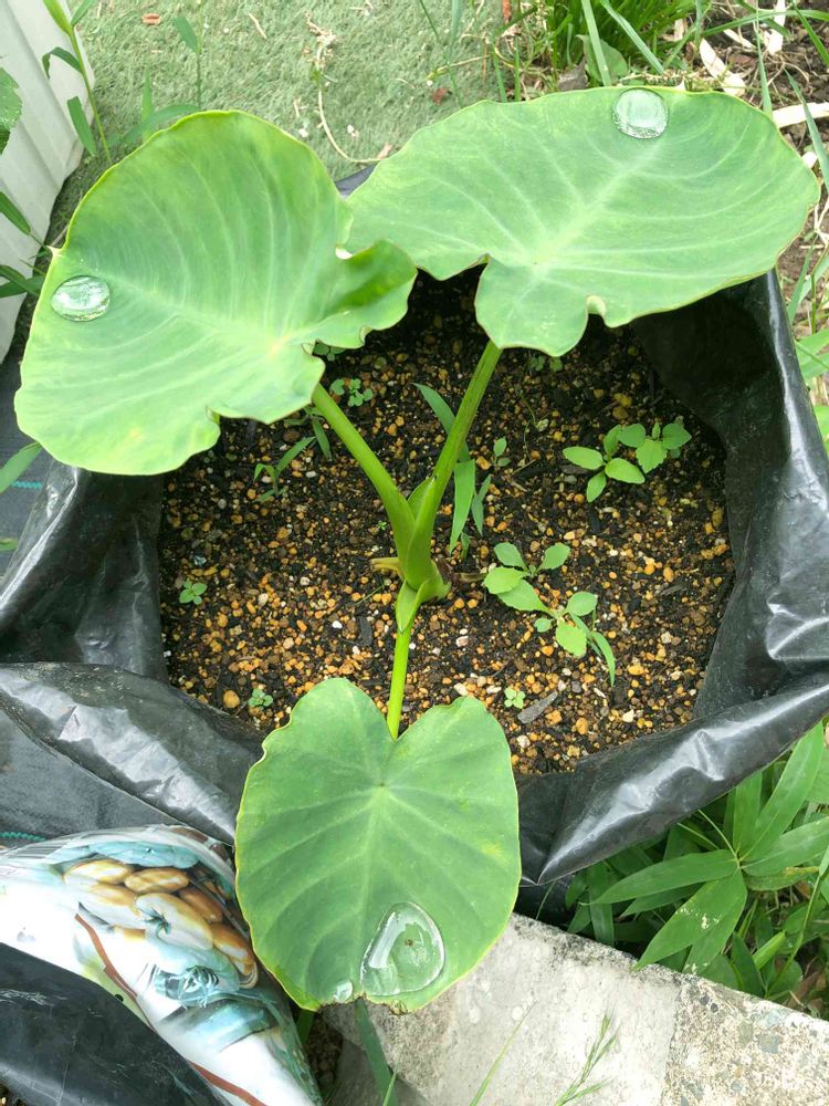 令和3年6月23日 (曇り)☁️. ^_^ おはよーございます 小さい庭の朝の見廻りしています。里芋の葉って 大きな観葉植物みたーい💕雨水がコロコロしてしているのも可愛い😍❣️