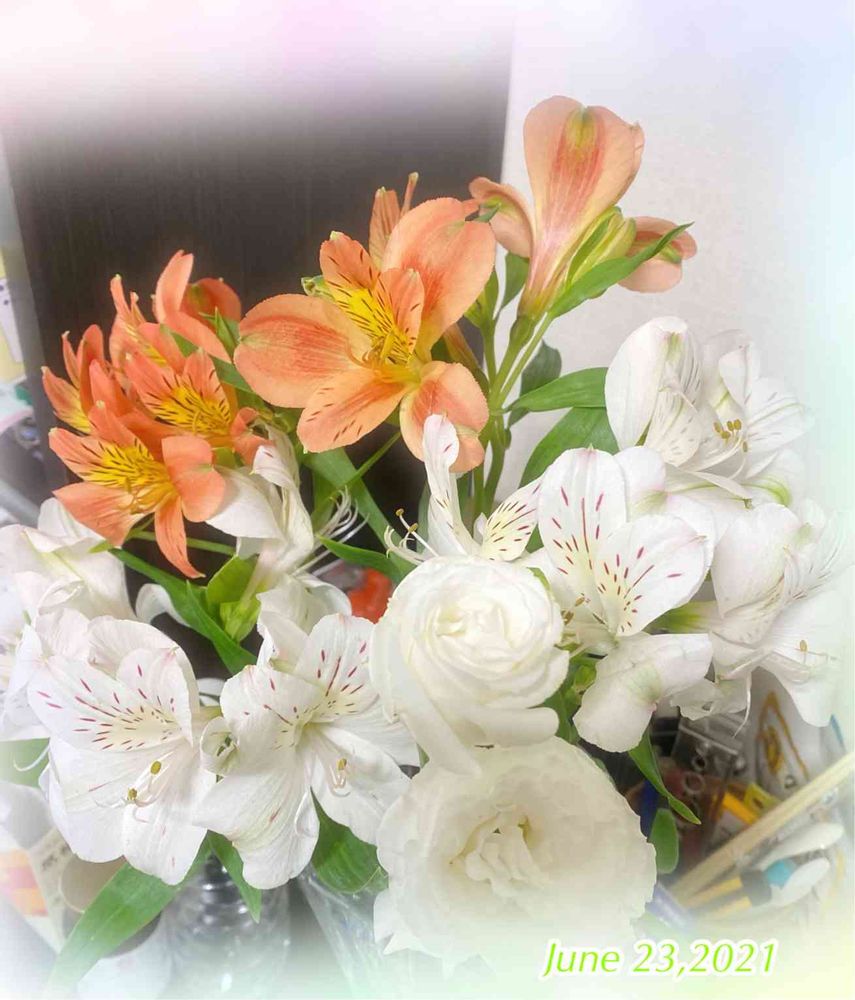 白のトルコ桔梗綺麗ね⤴️アルストロメリアの色とよくあうわね❤️👍👍(^_^)v