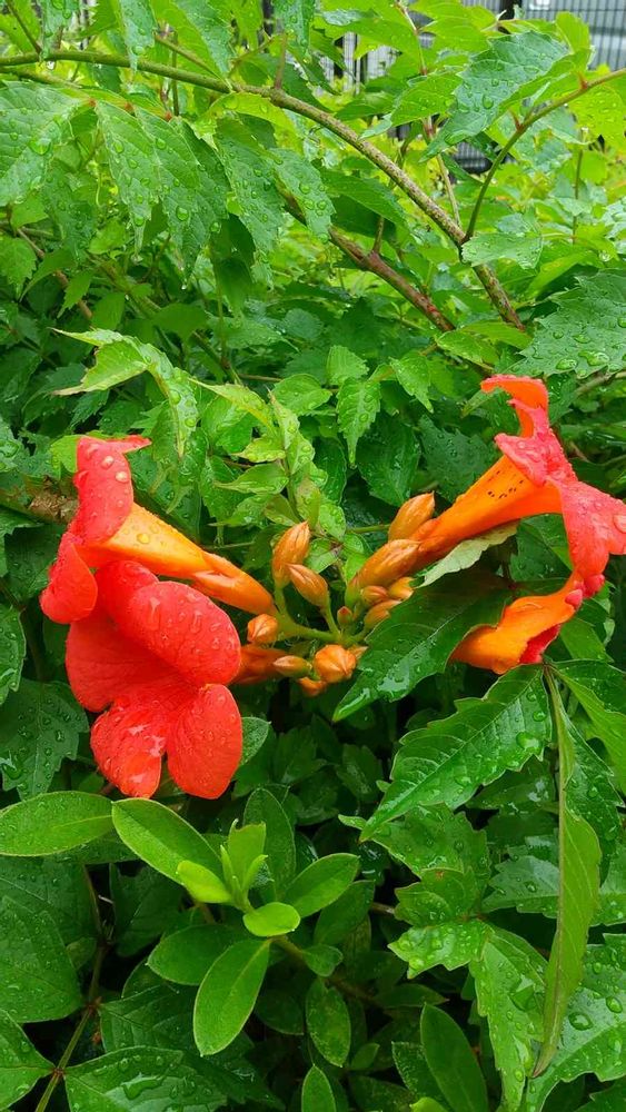 ノウゼンカズラとアメリカノウゼンカズラの交配種で、アイノコノウゼンカズラ(マダム・ガレという園芸品種)もあるそうですよ😅
