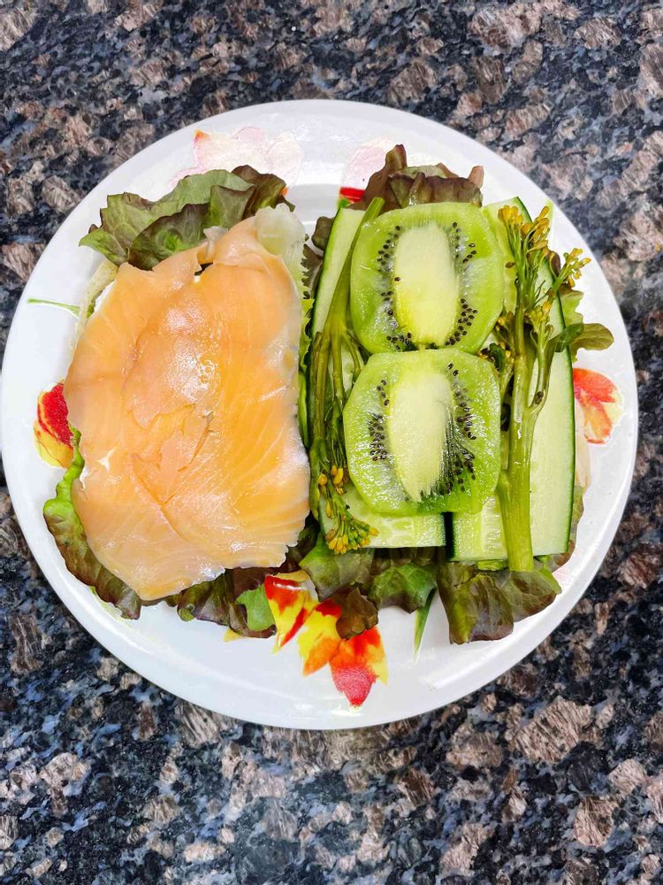 バタビアレタス、胡瓜、キウイと、クリームチーズ、スモークサーモンのサンドイッチ。パプリカ入りパン使用。