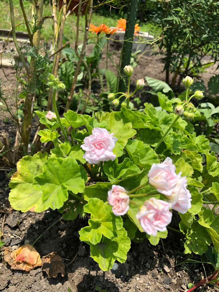 ジャーマンカモミールが茂って影になっていたローズゼラニウム