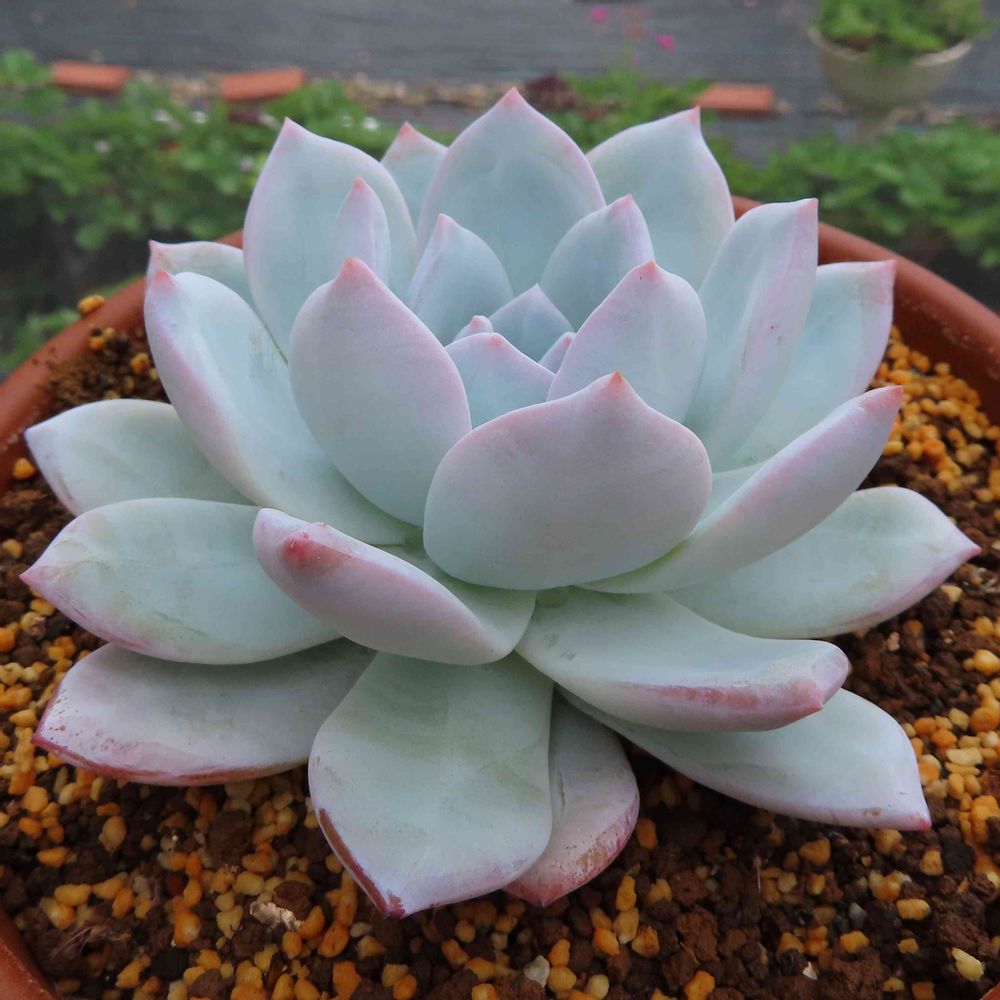 夏は白い多肉が美しい。冬の姿と比べて締まった形で見映えがいい。わずかに残る爪先のピンクも白によく合っている。