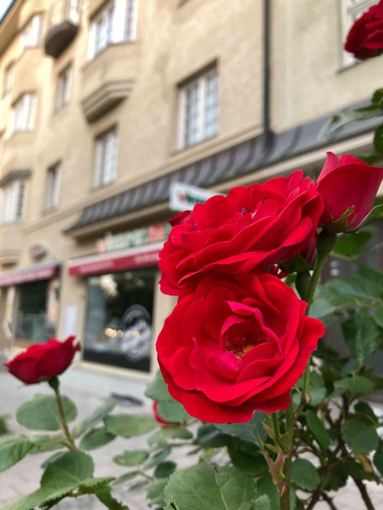 🌹真っ赤な薔薇の花が よく似合う街角 建物ですね〜