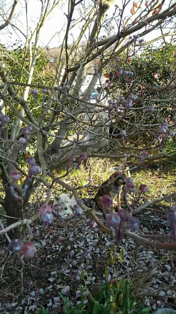 すっかり葉を落とした花水木の落ち葉でまったりしている2匹の野良犬ちゃんです(笑)蕾が春を待ってます🌼🌼