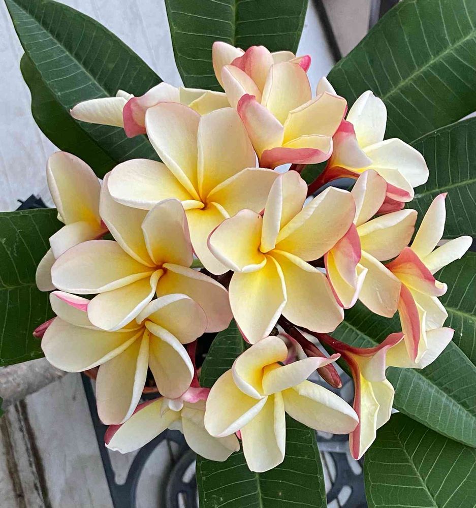 プルメリア「タイ・ジェイド」の花がほぼブーケ咲きになりました😊