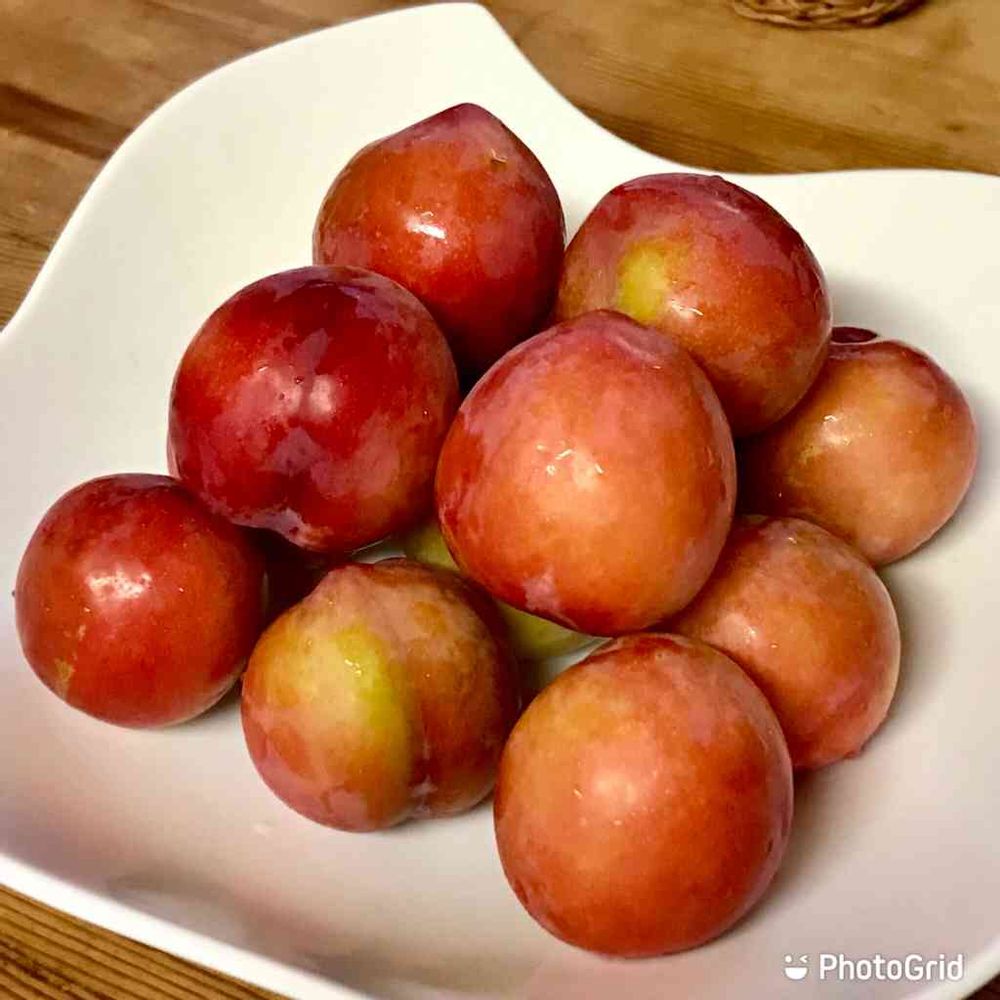 今日の果樹園の恵み。朝はほんのりピンク色でも夕方には結構赤く色付いてる😊。スモモは短期間で一斉に色付くから、早採り気味に収穫していかないと、あとが大変💪。まだ、🐦や🦝は静かだね〜👍。