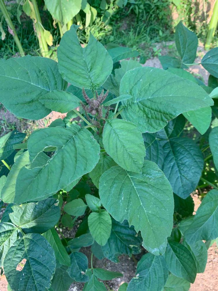 学校の畑でダイズを育てていたのですが、違う葉っぱも出てきました。一番上に花粉がたくさんついています。教えていただけると助かります!