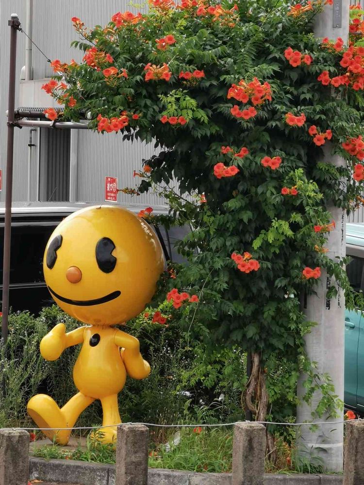 急行電車の乗りかえ駅のホームから見えるノウゼンカズラとPくん!🤩🌿