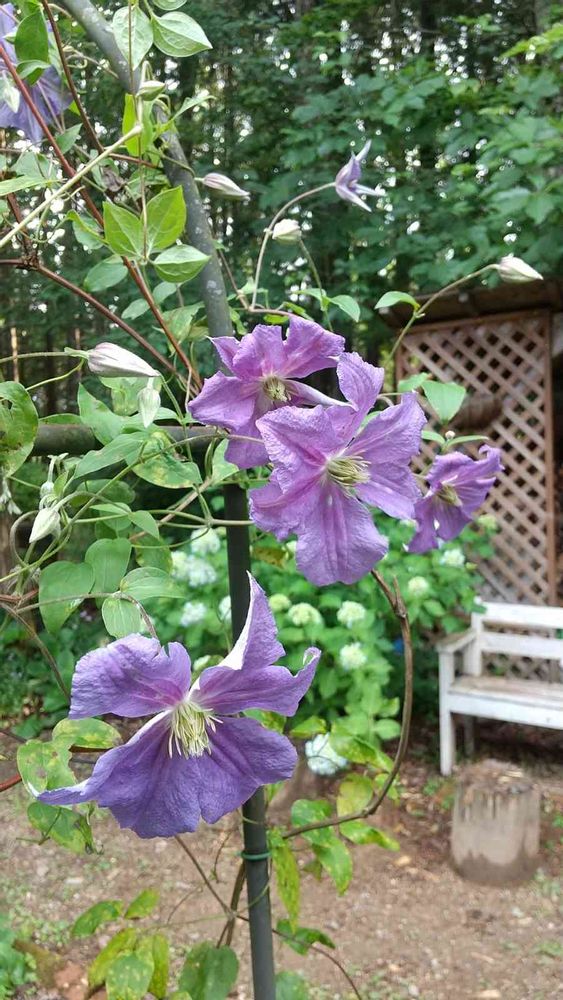 薪小屋前のアーチのクレマチス、今度は優しい紫色のパール・ダズールが咲きました💜😊💞