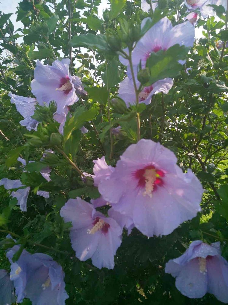 朝日を浴びた、ムクゲの花💠上↑はピンク色💗下↓の方は、やや紫がかってます。この気候で、イッキ咲き始めました。