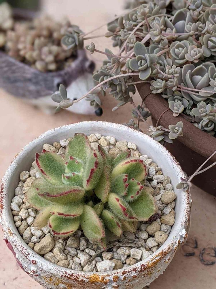 子持ち蓮華さん、もりもりになりすぎて勝手にちぎれて落ちてるからまたそれを違う鉢に置いたりしてみてる。
