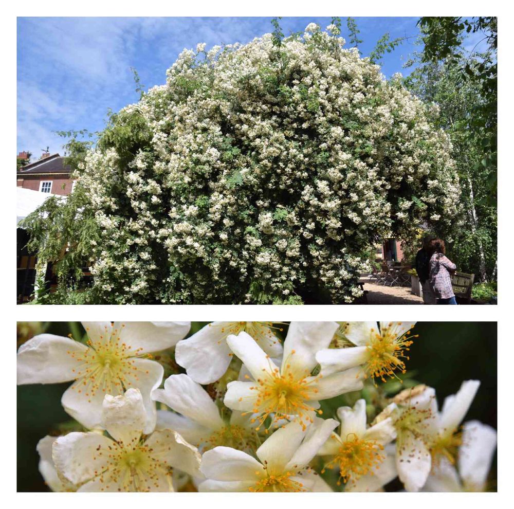 ヒマラヤンムスクローズ。白の一重で香りがします。ランブラーローズの起源となるバラです.此処のは2015年あまりに大きくなりすぎ、横にある大木に覆い被さっていましたがその木も老木となり危ないのでぱっさり切られました。でもまた以前の様に成長しています