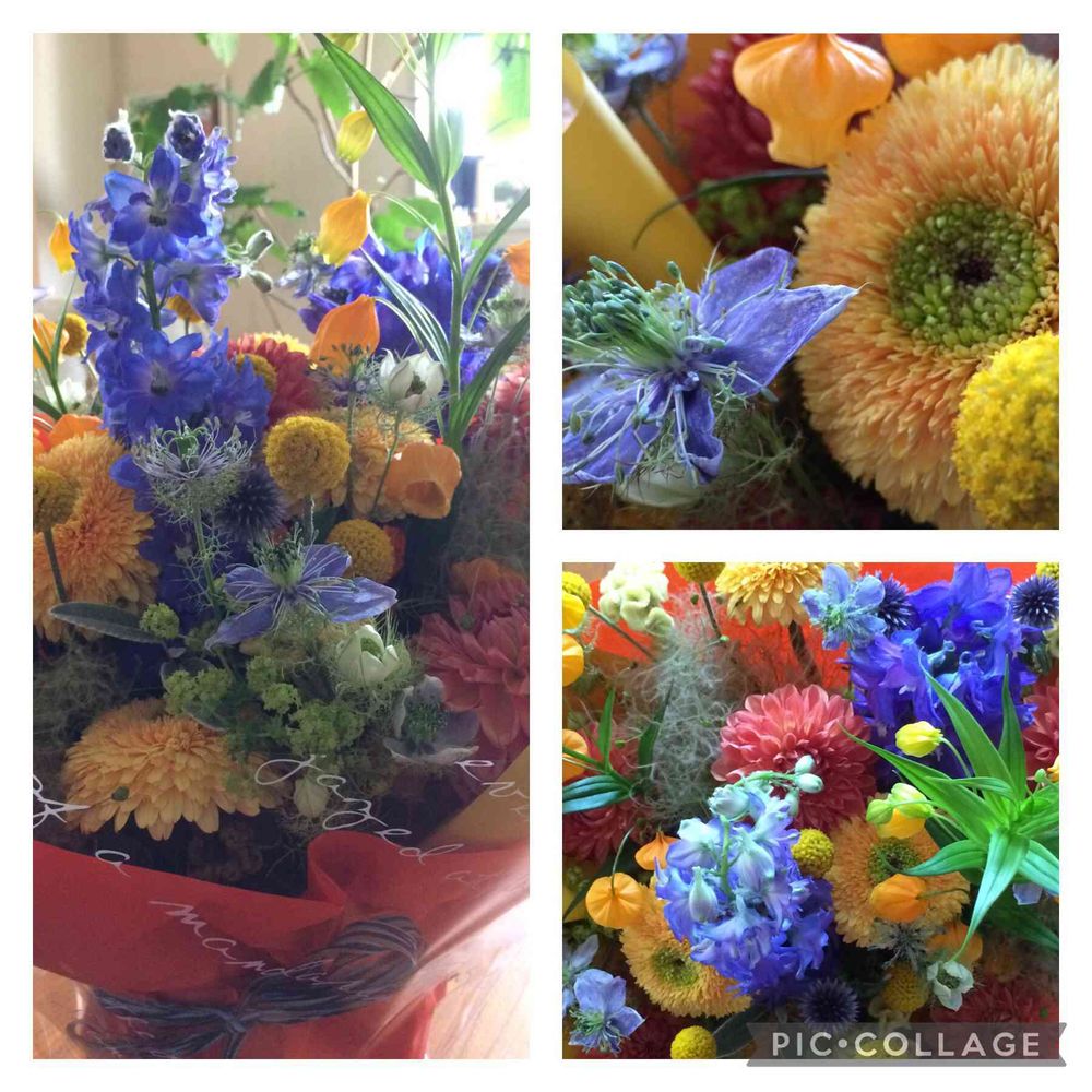青いお花に 黄色、オレンジ色のダリア… どこに視線を当てても素敵で 元気をもらえます✨共感してもらえて嬉しいです♡