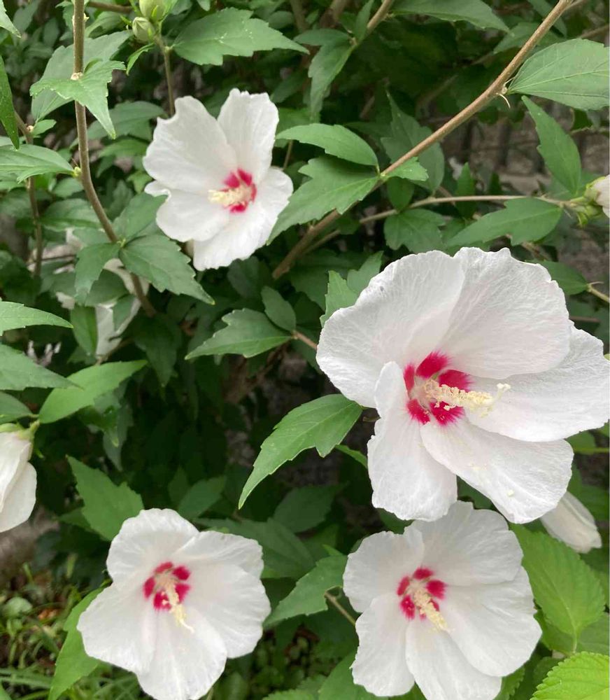 ムクゲ、キレイ~🎶中の赤が、白い花を引き立たせていますね🎵