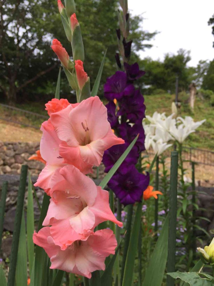 真っ赤なグラジオラスが咲いてから1週間遅れでピンクと紫が咲き出しました🥰