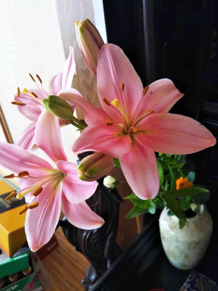 百合の花(品種?)植えて20年毎年咲いてくれますが、ジャーマンアイリスから侵食され、浮きあがり気味ですが、ほんと根性魅せ茎伸ばし咲いてくれます。早速朝取り切り仏壇用に、黄色は西洋菊と白バラの蕾です😄