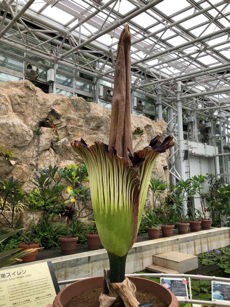 急遽、有給休暇を取って、ショクダイオオコンニャクを見に神代植物公園へ。何と、開花している🤗 恐怖の臭いは? 全然しませんでした💦 職員の方も不思議がっていました😅 夜咲いて、今は萎みかけだからカナ(^^)