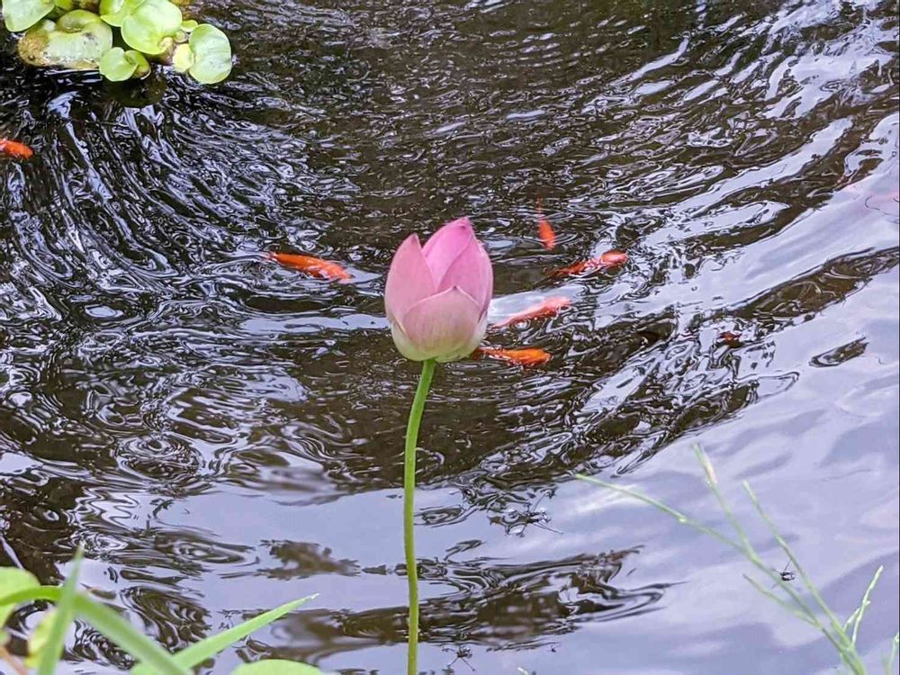 少し開いた蕾の向こうに赤い金魚がちょうど良く