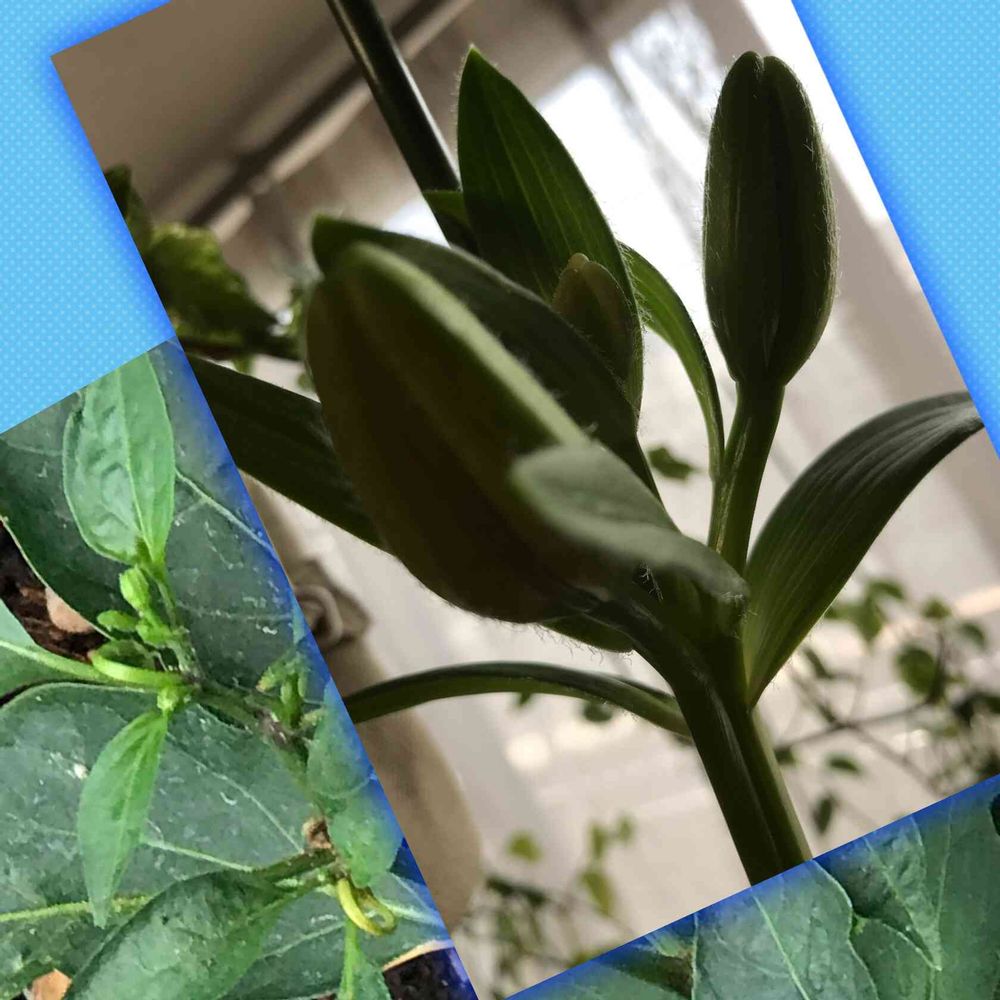 ❀金曜日の蕾たち❀に 参加させていただきます🤗 百合の蕾が少しずつ膨らんでいます🧡 もうひとつは、『ベランダ菜園』のなかの[トウガラシ] の花の蕾ε-(´∀`*)ホッ