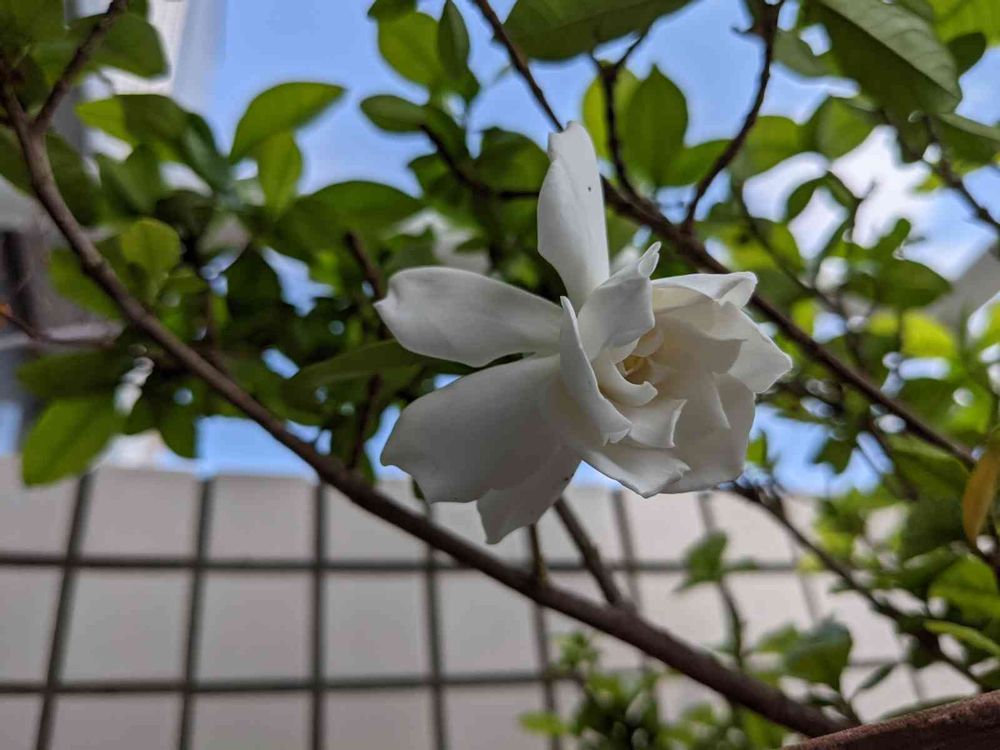 本日は、白い朝顔とクチナシの咲き初めです。(^^)