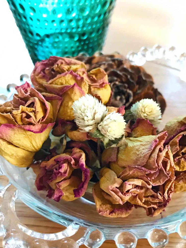 ドライフラワーをアンティークなキャンドルウィックのガラスの器に並べました✨